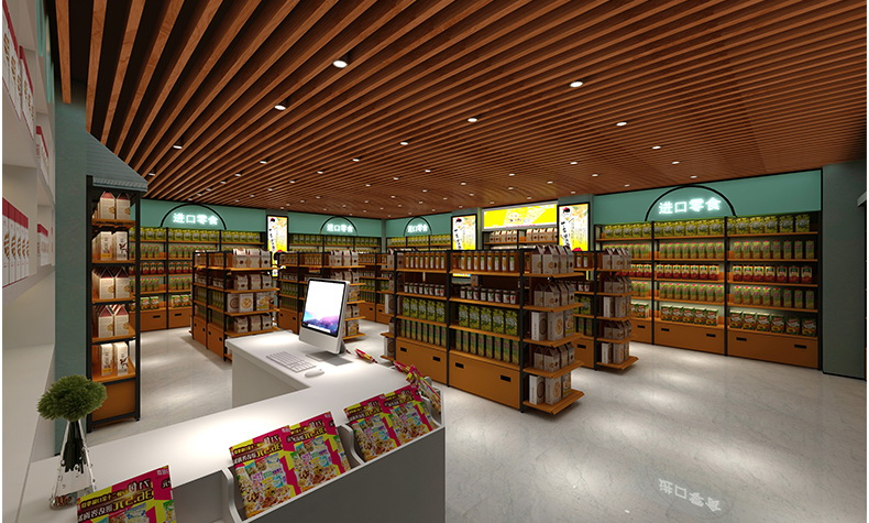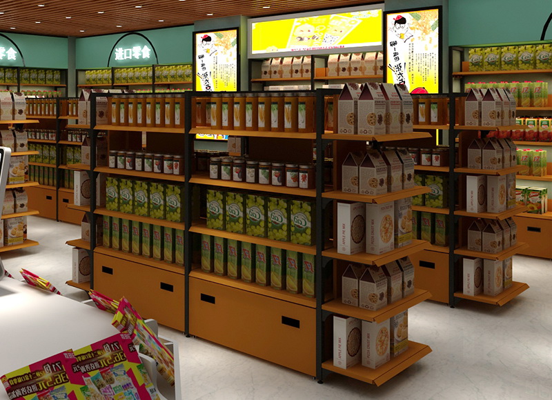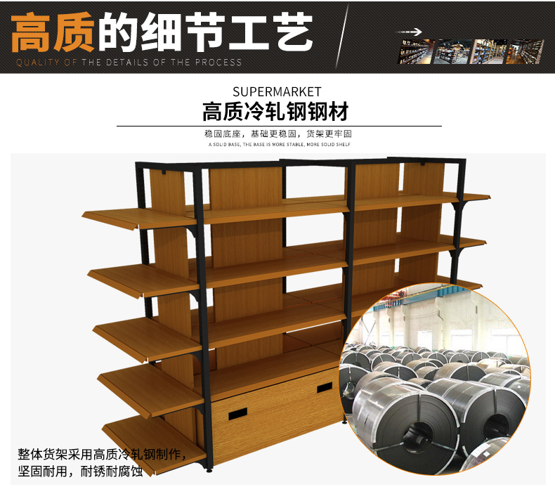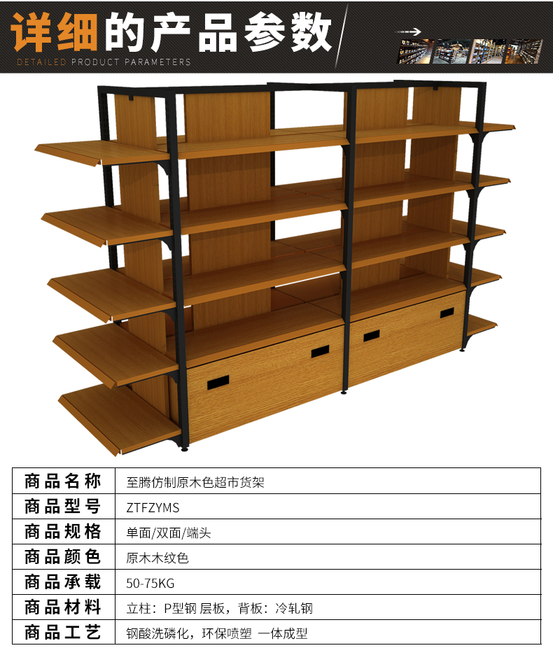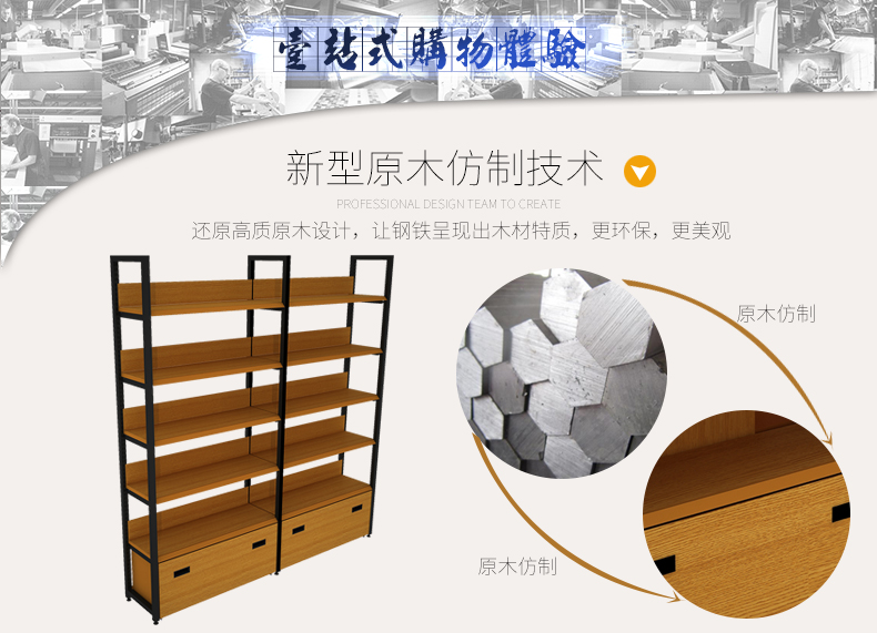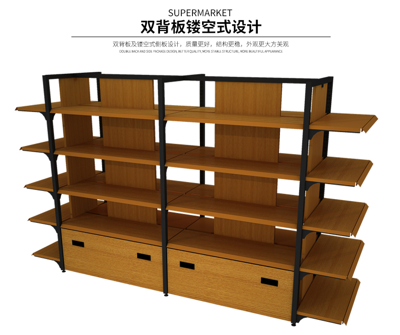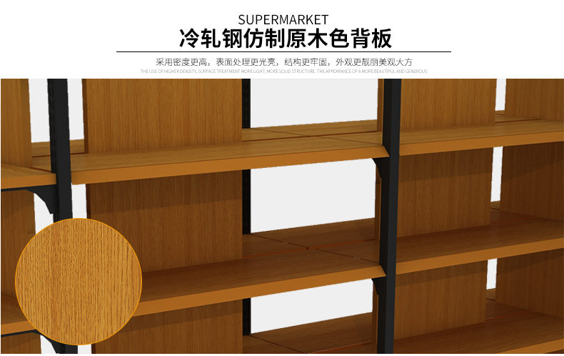 1 木紋超市貨架吸取了木材的視覺效果和鋼材的承載及輕便的優(yōu)點(diǎn),博采眾長。