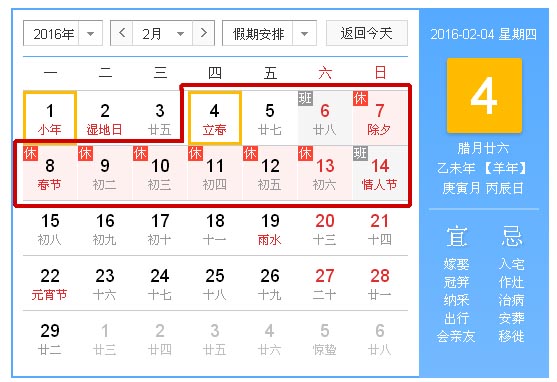 2016年2月4日——2016年2月14日放假,共11天,不安排補班。